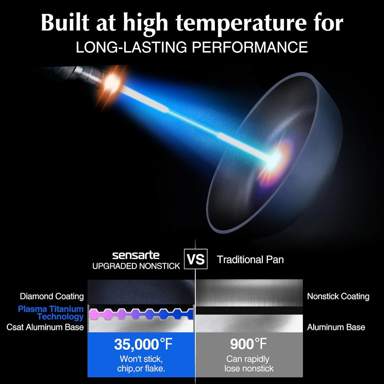 Technology Upgrade ! – Won't stick, chip or flake. Super-heated at 30,000°F, plasma titanium particles are fused to the surface of the pan, creating a super-hard, textured surface that interlocks with our exclusive diamond coating for a superior bond.Tested by professional laboratory results show 89,000 times after machine wear test, still non-stick.