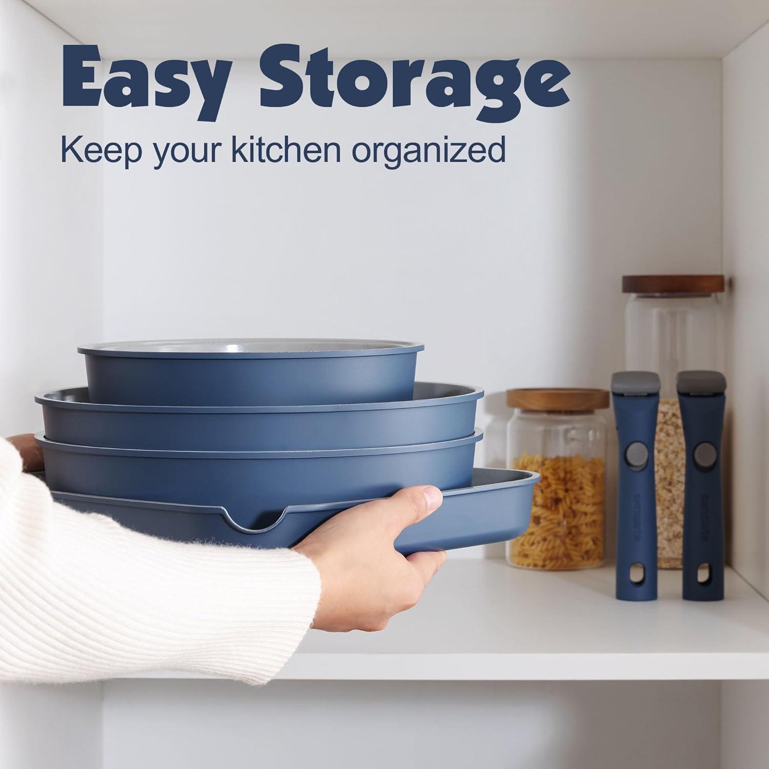 Easy Storage – Save up to 70% more space with stackable pots and pans set and detachable handles, keeping your kitchen neat and organized. Allowing for storage in cabinets or RVs.