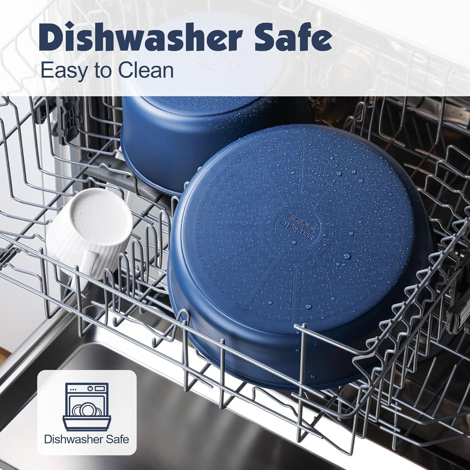 Dishwasher Safe – Cleaning is a breeze. Professional wear-resistant design for the bottom of the pan set that prevents black residue even when used in the dishwasher.