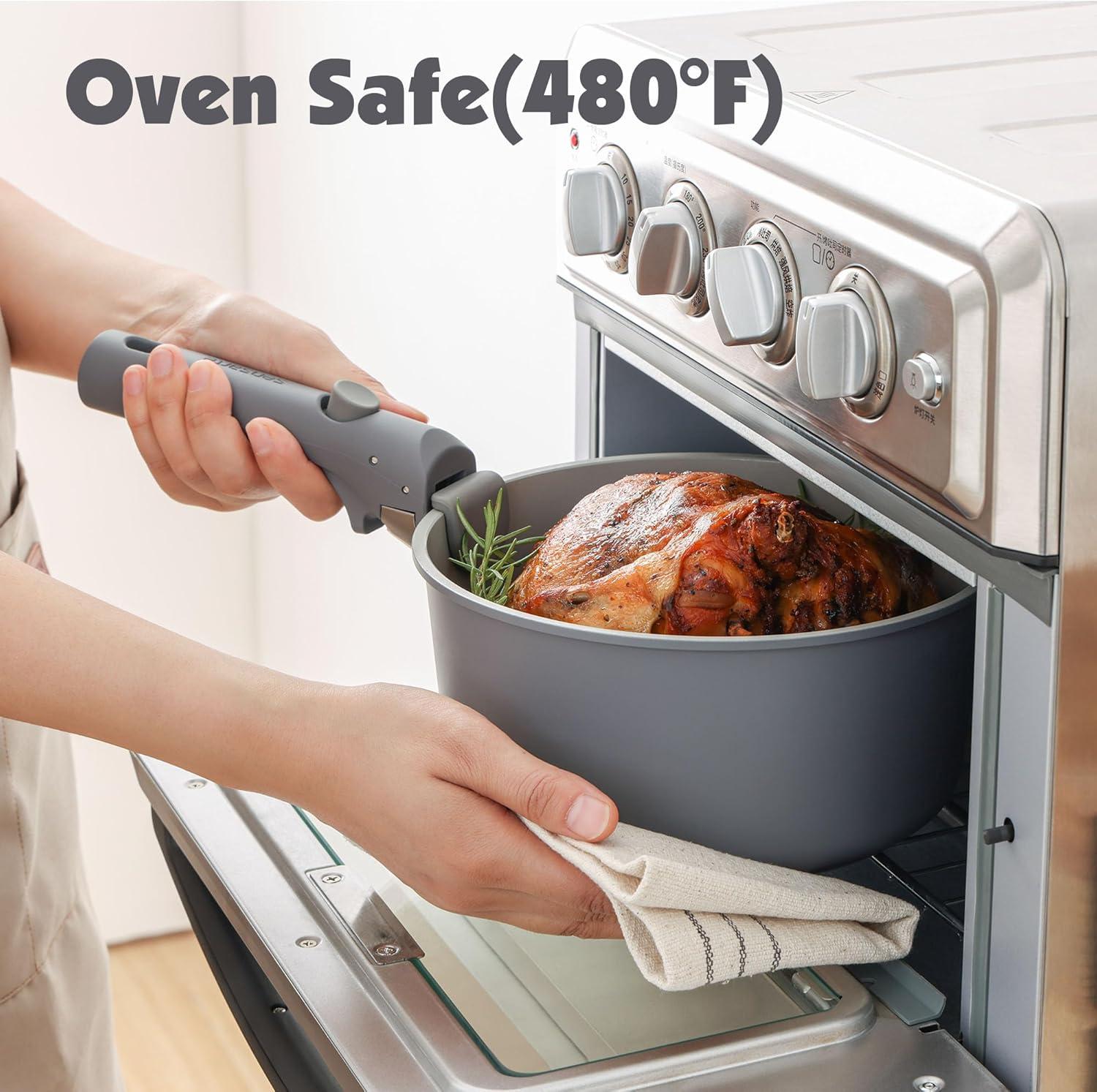 Easy Storage – Save up to 70% more space with stackable pots and pans set and detachable handles, allowing for storage in cabinets or RVs.