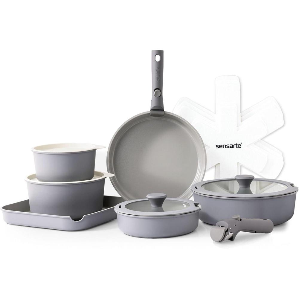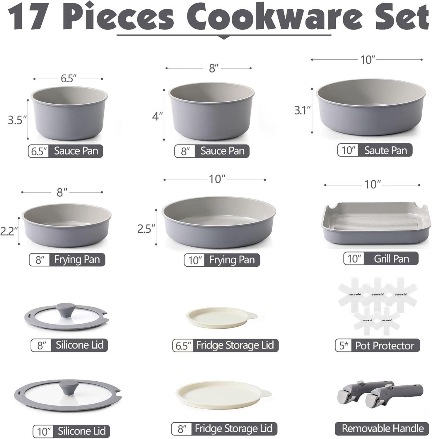 SENSARTE 17 Piece Pots and Pans Set, Nonstick Detachable Handle Cookware Set, Induction Kitchen Cookware Set with Removable Handle, Healthy Non Stick for RV, Dishwasher & Oven Safe, PFOA Free (White)(Gray)