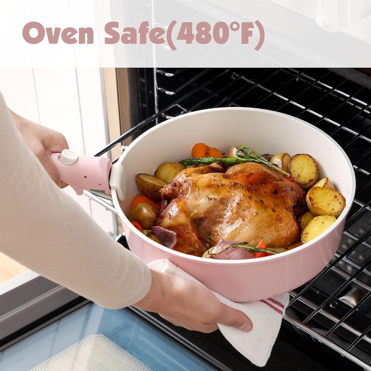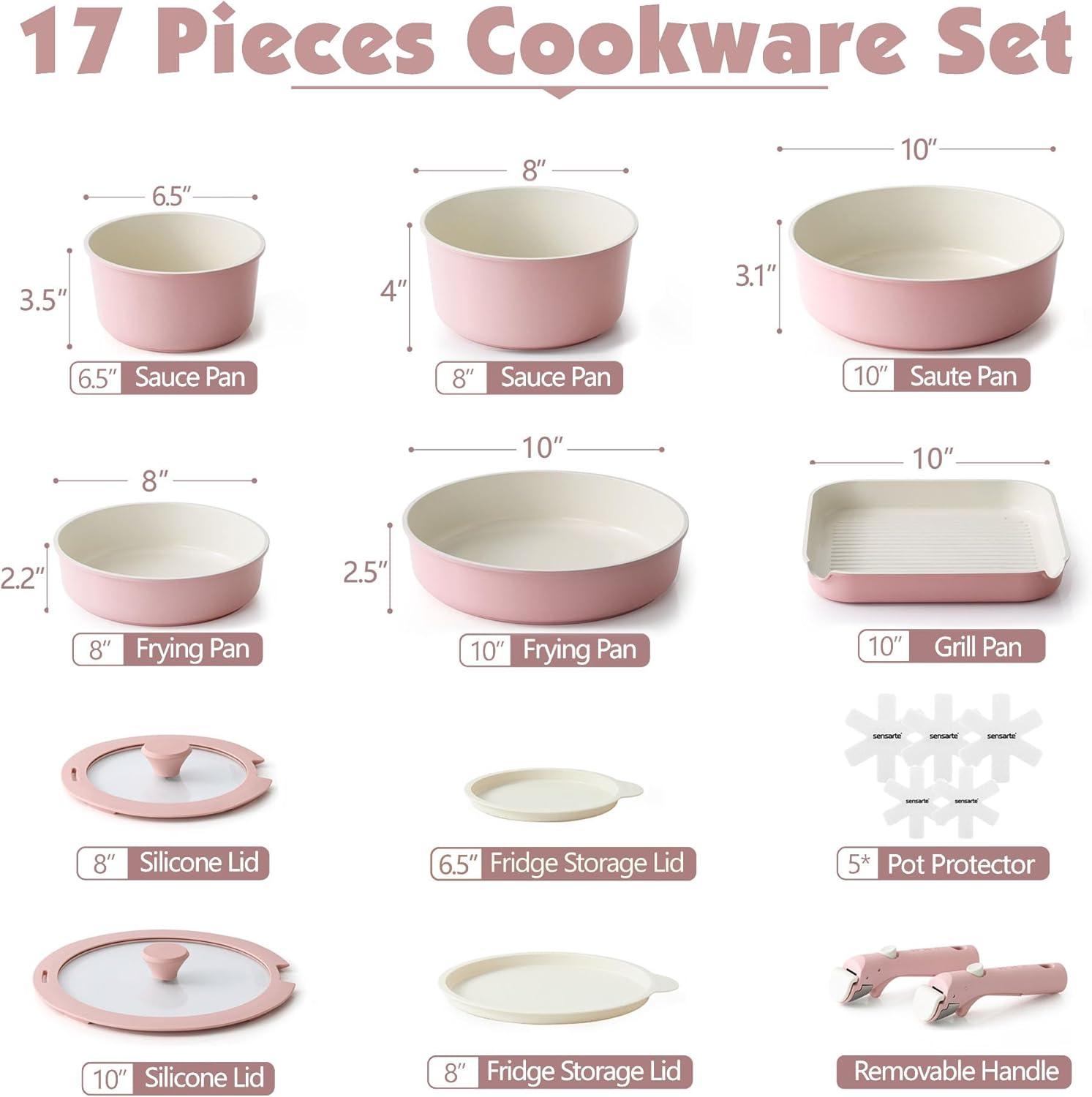 SENSARTE 17 Piece Pots and Pans Set, Nonstick Detachable Handle Cookware Set, Induction Kitchen Cookware Set with Removable Handle, Healthy Non Stick for RV, Dishwasher & Oven Safe, PFOA Free (White)(Pink)
