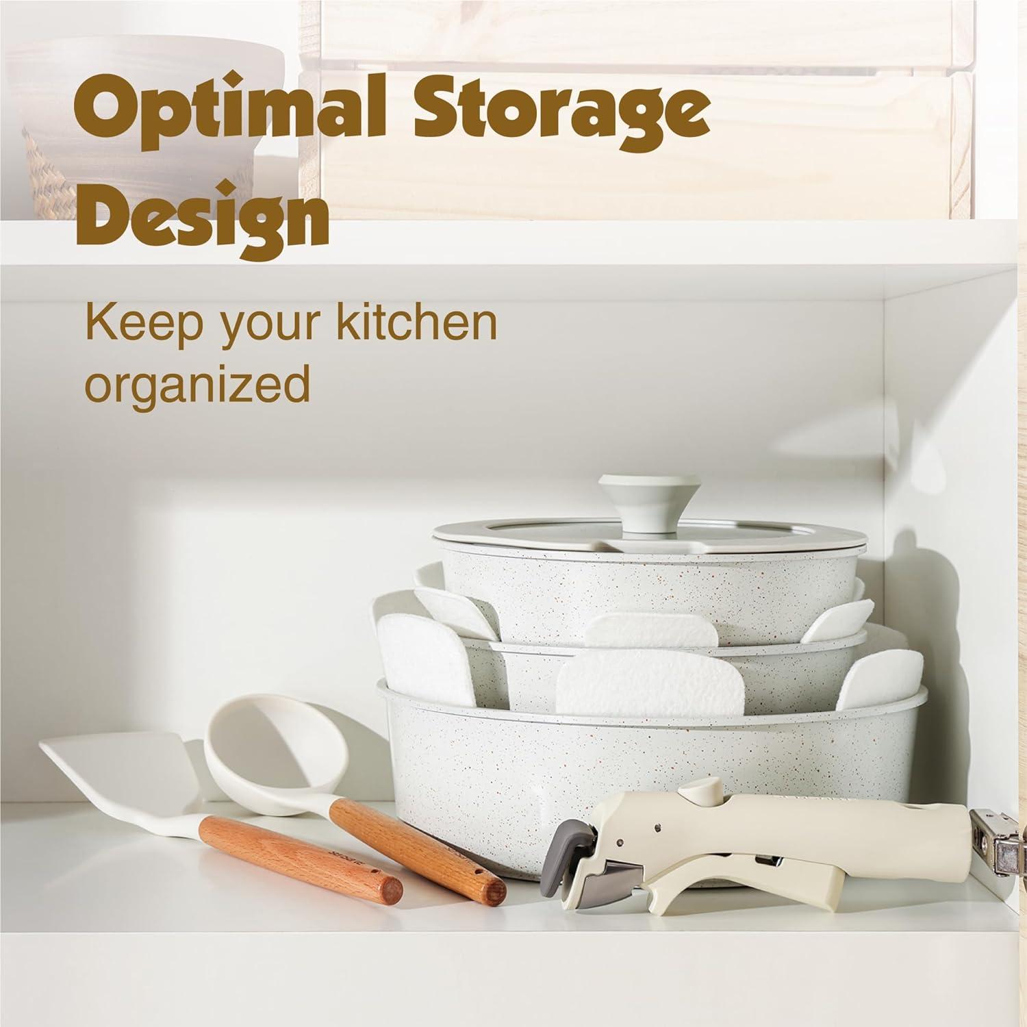 Easy Storage – Save up to 70% more space with stackable pots and pans set and detachable handles, allowing for storage in cabinets or RVs.