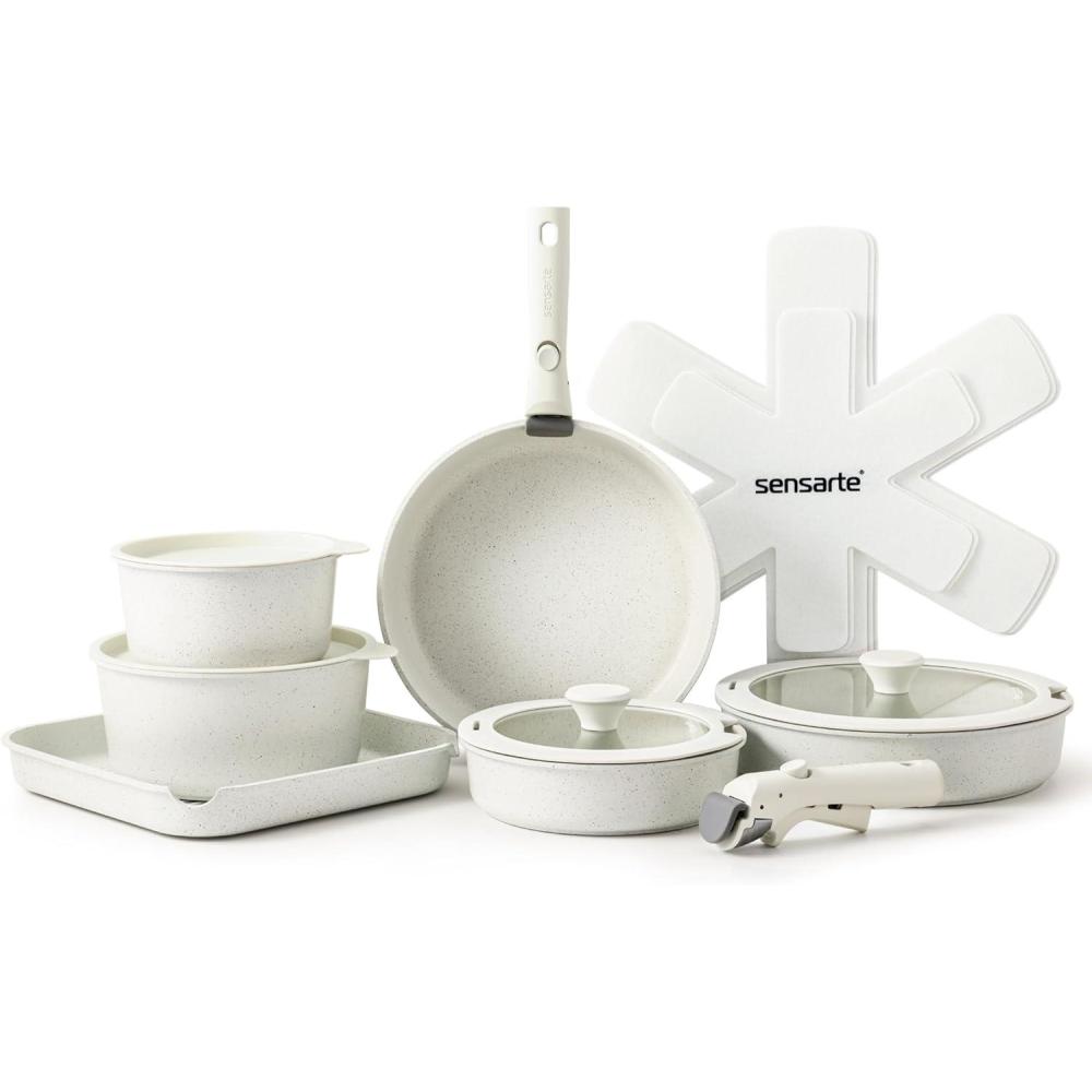 17-Piece Cookware Set Includes – 1.5QT Sauce Pan, 2.8QT Sauce Pan, 8 inch Frying Pan, 10 inch Frying Pan, 10 inch(4QT) Saute Pan, 10 inch Grill Pan, Removable Handle*2, 8 inch Glass Lid, 10 inch Glass Lid, Pot Protector*5, Fridge Storage Lid*2