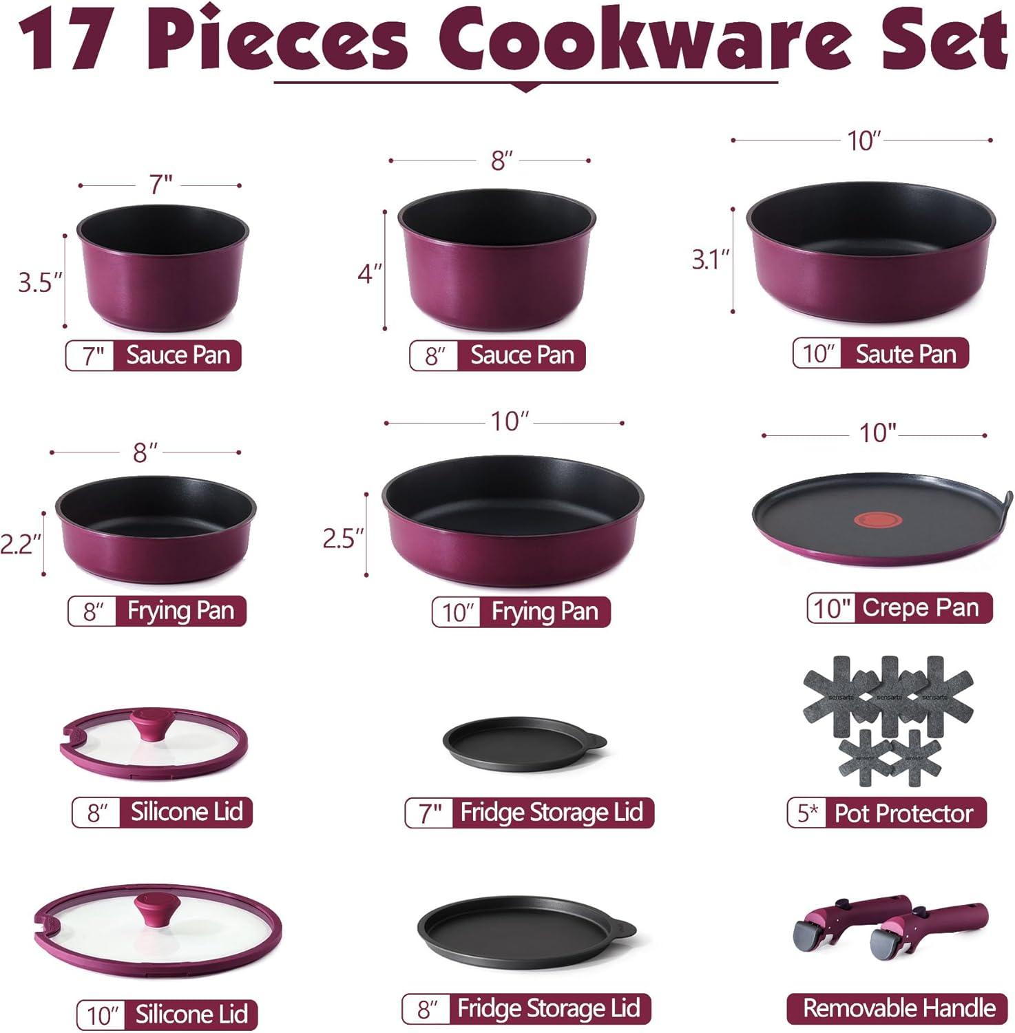 SENSARTE 17 Piece Pots and Pans Set, Nonstick Detachable Handle Cookware Set, Induction Thermo-Signal Cookware Set with Removable Handle, Healthy Non Stick for RV, Dishwasher & Oven Safe (Black)(Purple)