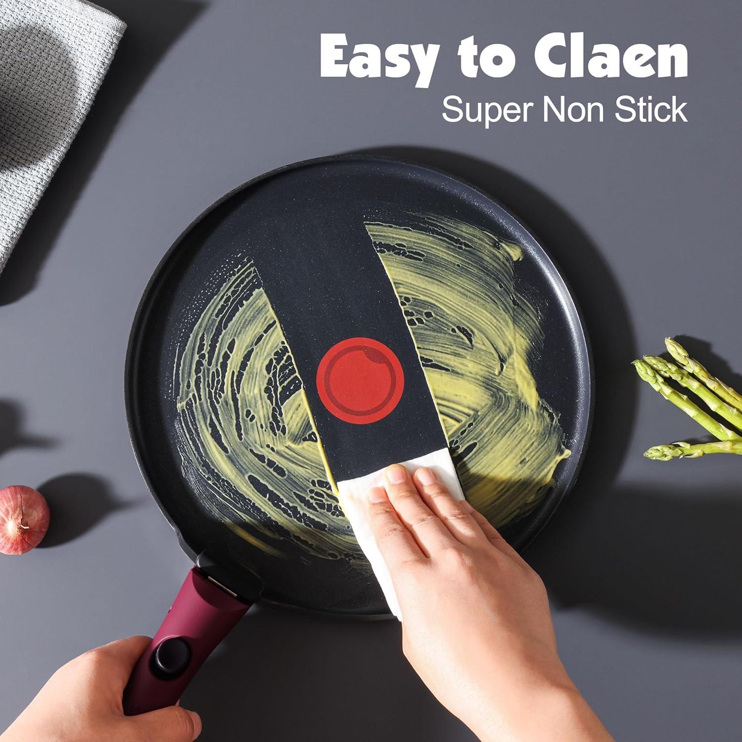 17-Piece Cookware Set Includes – 1.5QT Sauce Pan, 2.8QT Sauce Pan, 8 inch Frying Pan, 10 inch Frying Pan, 10 inch(4QT) Saute Pan, 10 inch Crepe Pan, Removable Handle*2, 8 inch Glass Lid, 10 inch Glass Lid, Pot Protector*5, Fridge Storage Lid*2