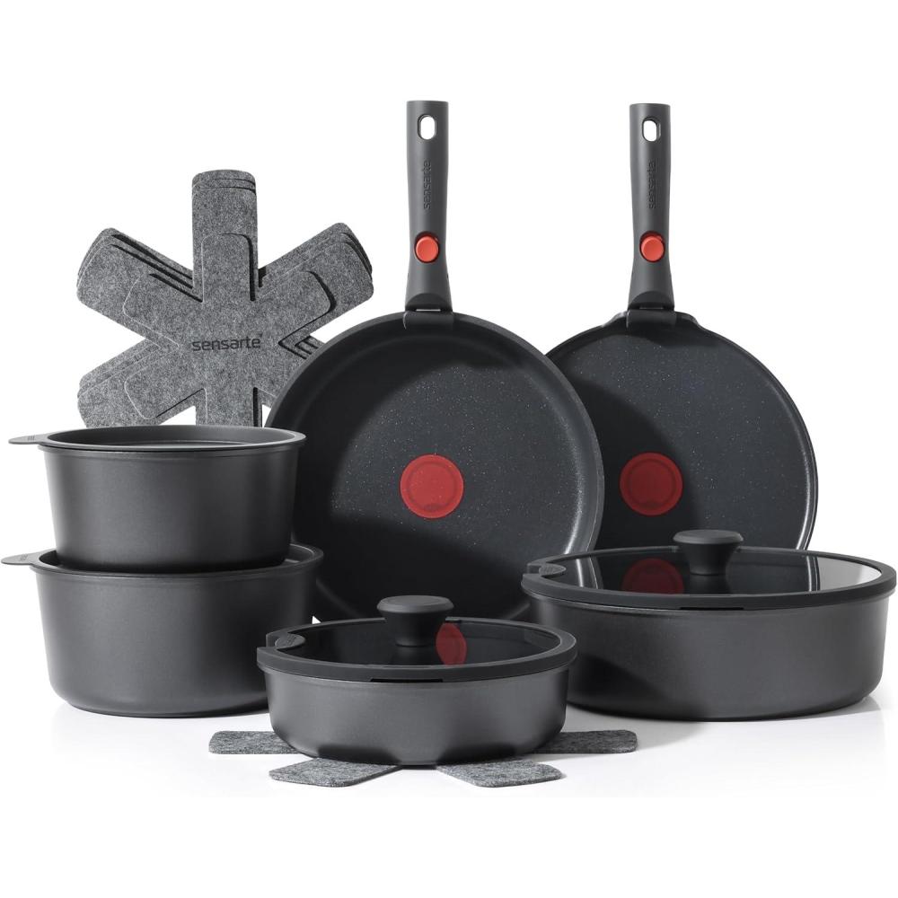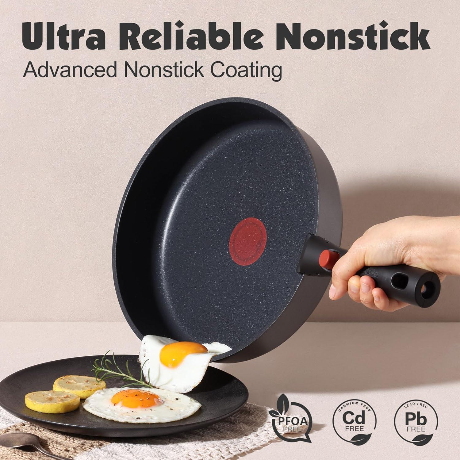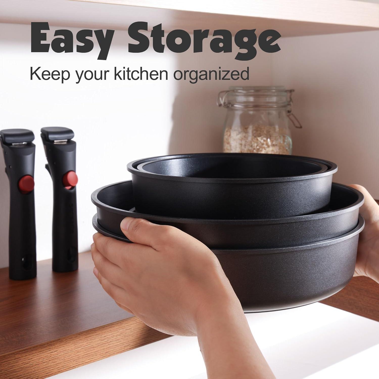 Easy Storage – Save up to 70% more space with stackable pots and pans set and detachable handles, allowing for storage in cabinets or RVs.