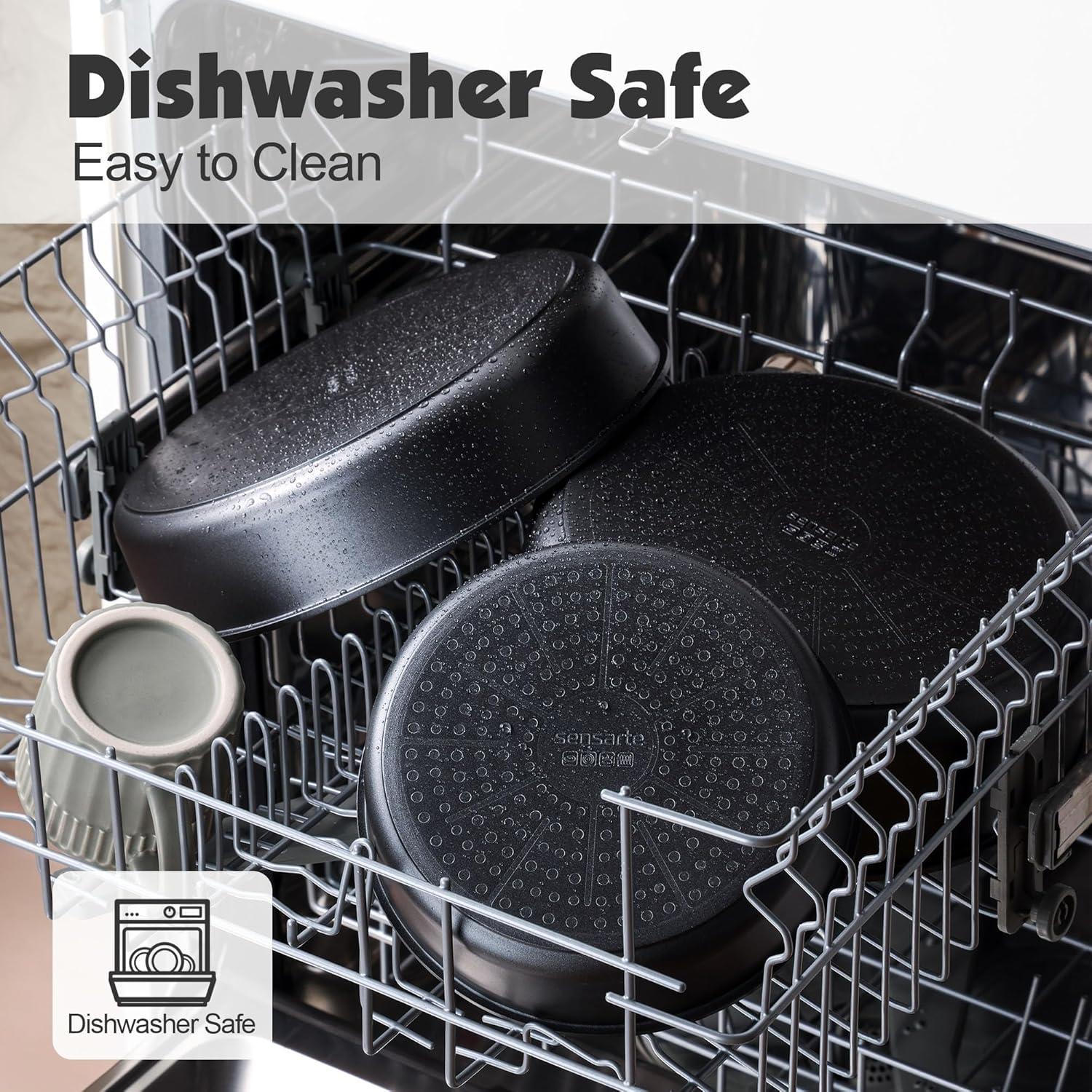 Dishwasher Safe – Cleaning is a breeze. Professional wear-resistant design for the bottom of the pan set that prevents black residue even when used in the dishwasher.