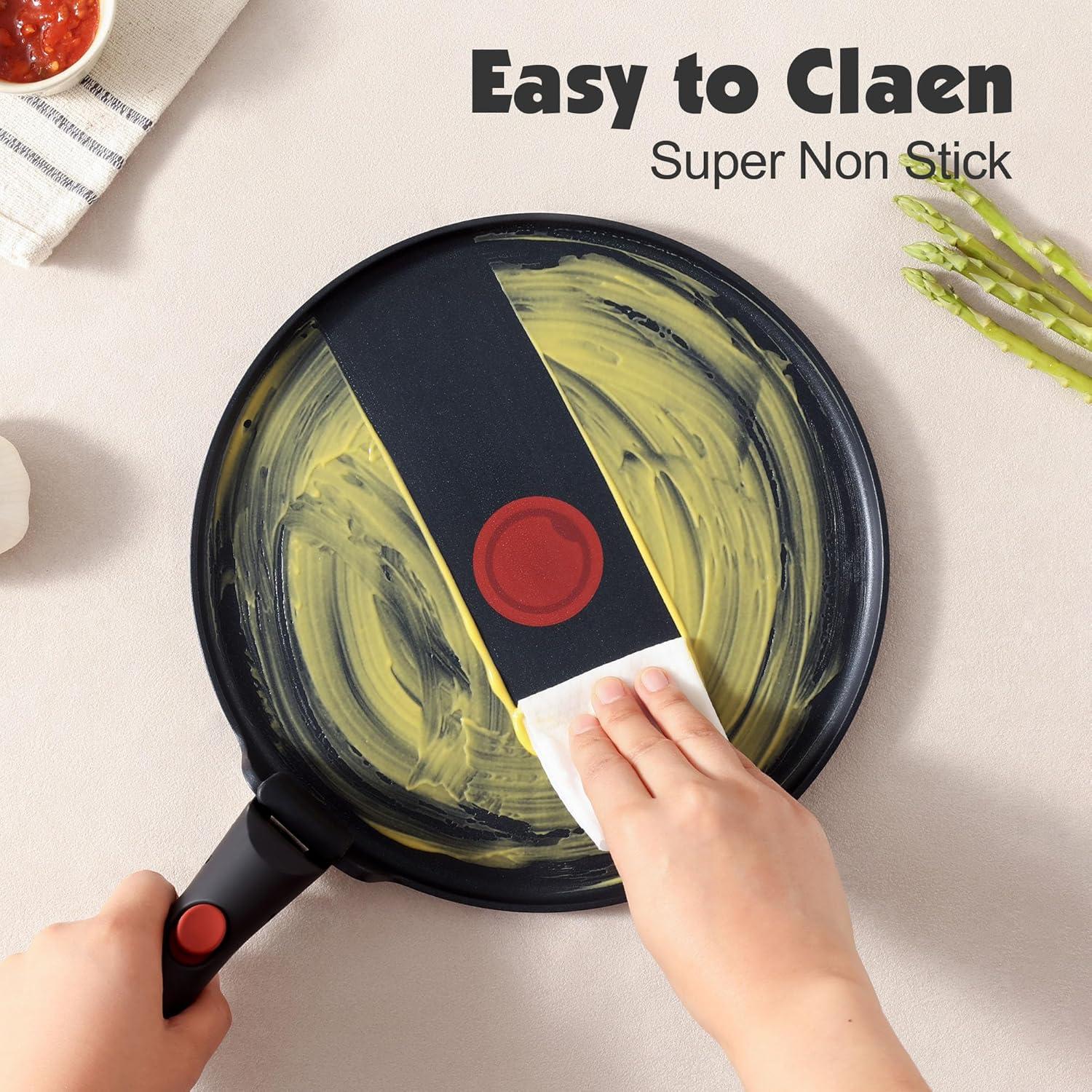 17-Piece Cookware Set Includes – 1.5QT Sauce Pan, 2.8QT Sauce Pan, 8 inch Frying Pan, 10 inch Frying Pan, 10 inch(4QT) Saute Pan, 10 inch Crepe Pan, Removable Handle*2, 8 inch Glass Lid, 10 inch Glass Lid, Pot Protector*5, Fridge Storage Lid*2