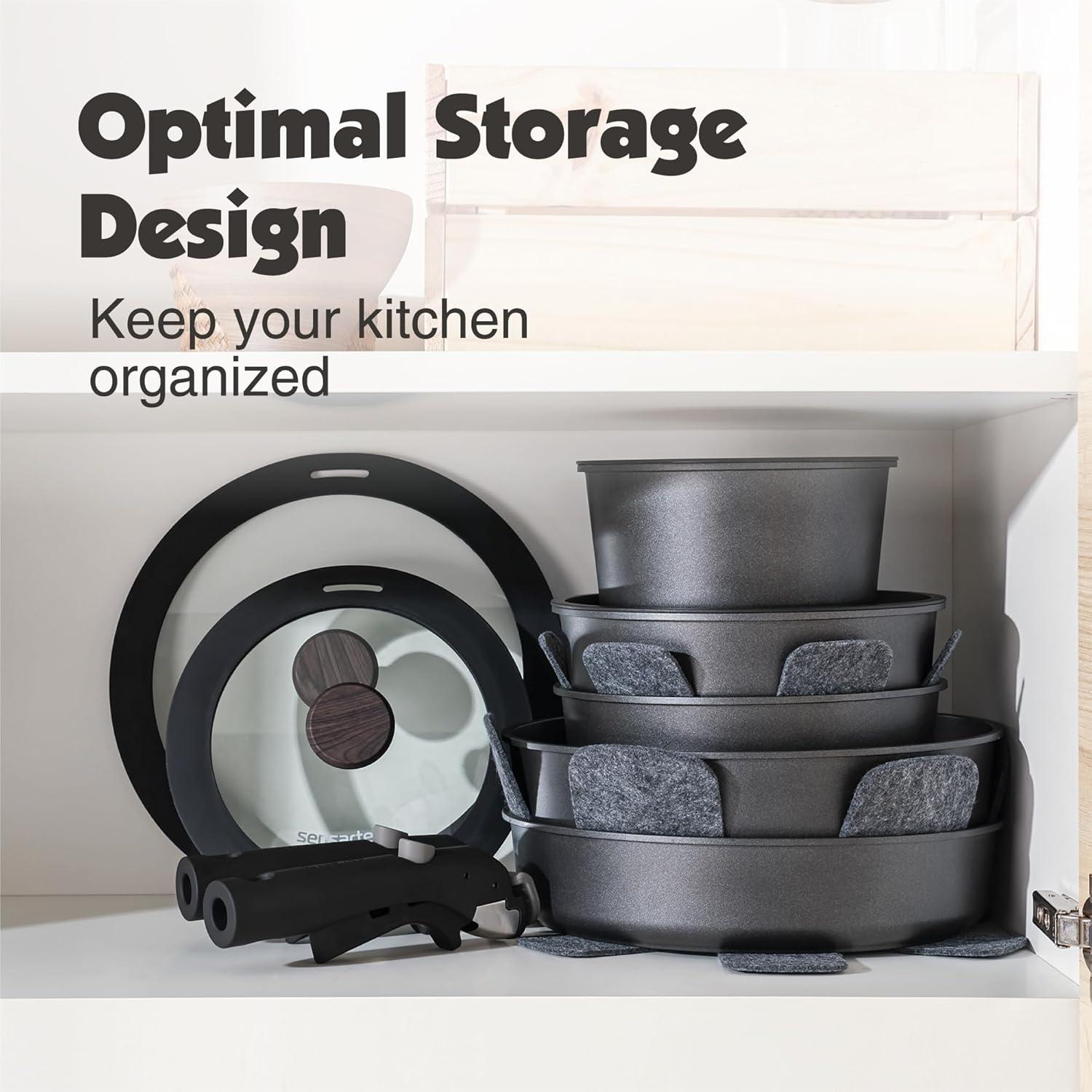 Easy Storage – Save up to 70% more space with stackable pots and pans set and detachable handles, allowing for storage in cabinets or RVs.