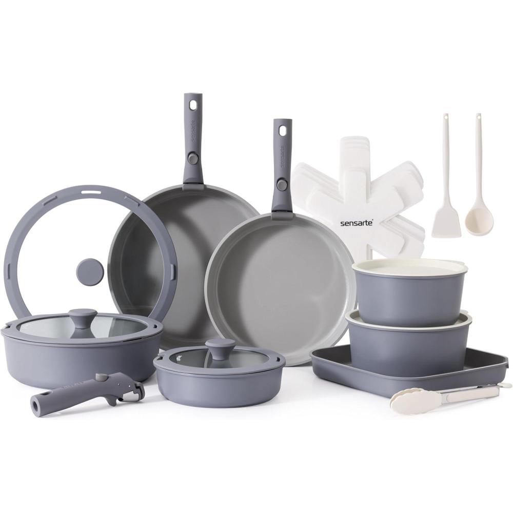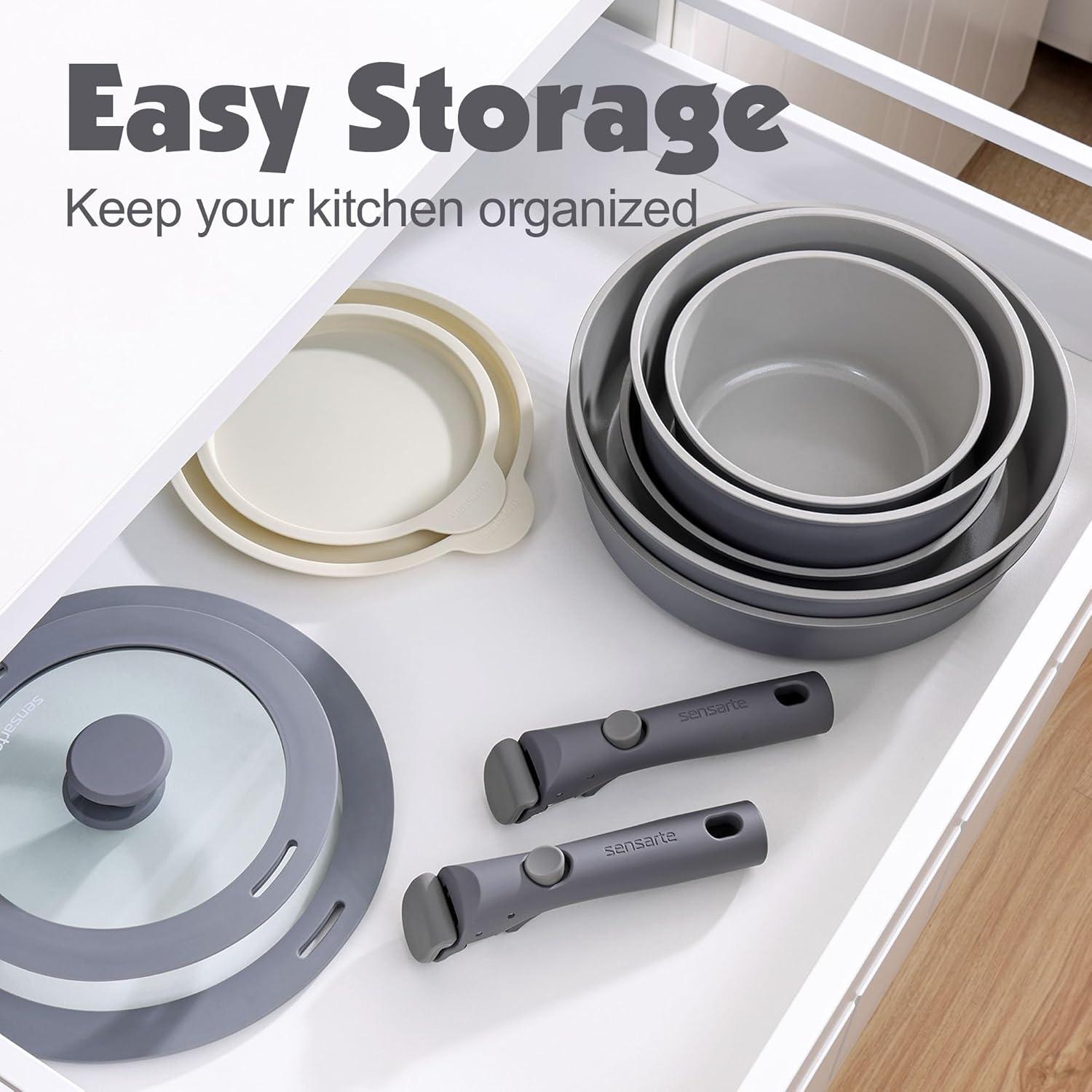 SENSARTE 24 Piece Pots and Pans Set, Nonstick Detachable Handle Cookware, Induction Kitchen Cookware Set with Removable Handle, Healthy Non Stick for RV, Dishwasher & Oven Safe (White)(Gray)