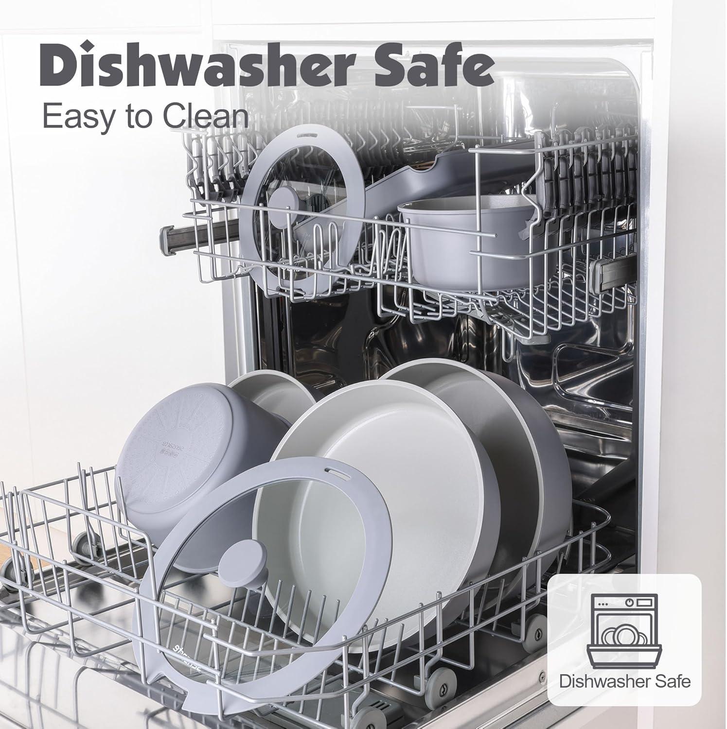 Dishwasher Safe – Cleaning is a breeze. Professional wear-resistant design for the bottom of the pan set that prevents black residue even when used in the dishwasher.