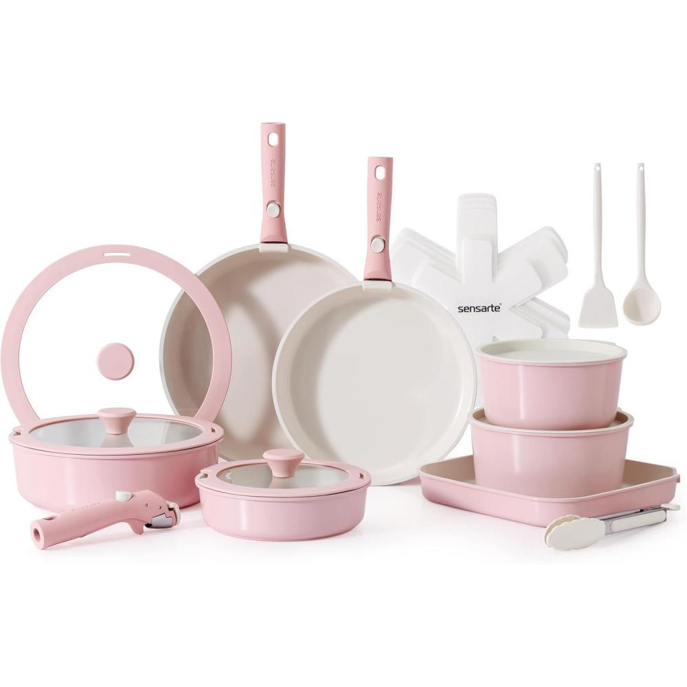 SENSARTE 24 Piece Pots and Pans Set, Nonstick Detachable Handle Cookware, Induction Kitchen Cookware Set with Removable Handle, Healthy Non Stick for RV, Dishwasher & Oven Safe (White)(Pink)