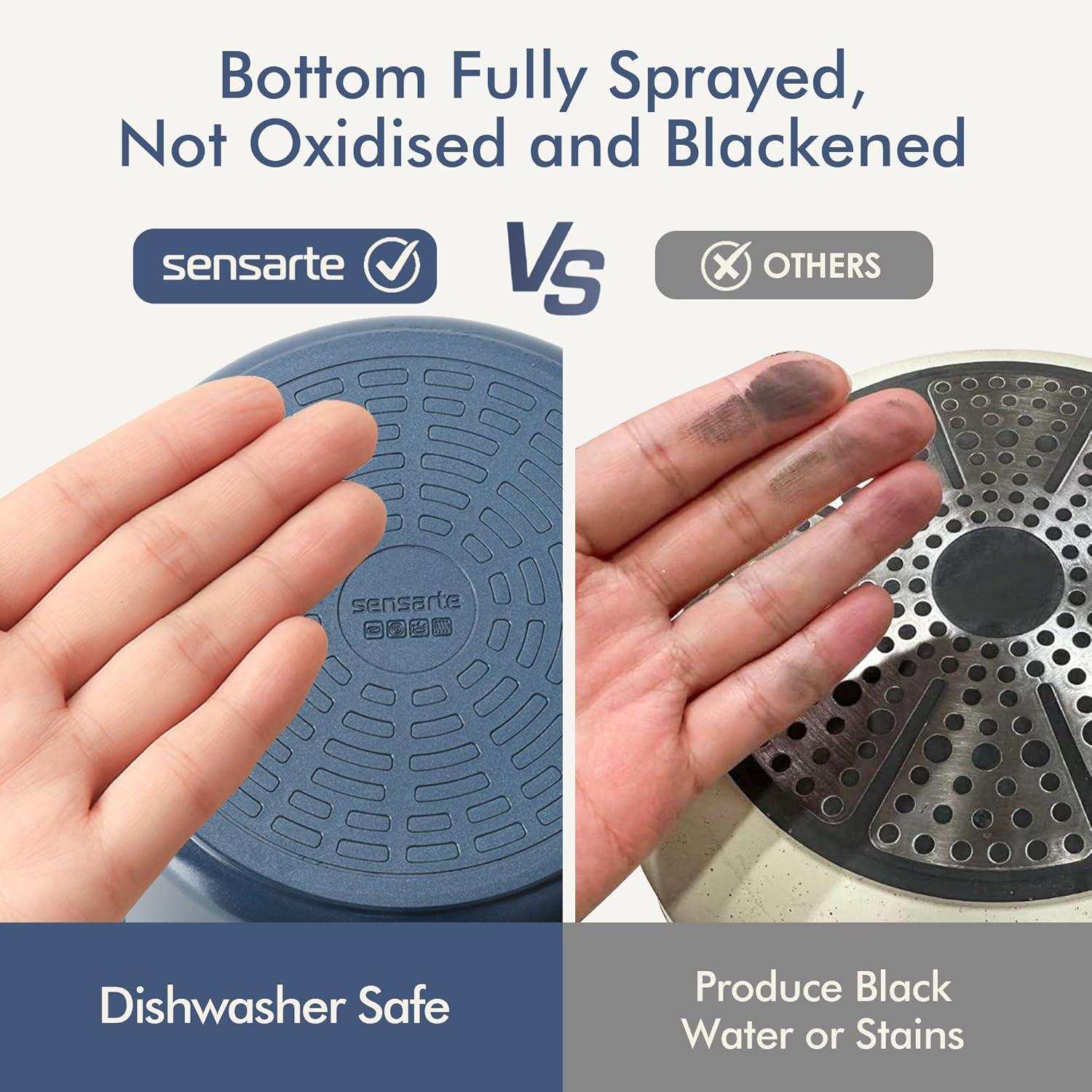 Dishwasher Safe – This pots and pans set is dishwasher safe with coated bottom, prevents black residue after washing. Hand washing is recommended and only requires a light wipe.