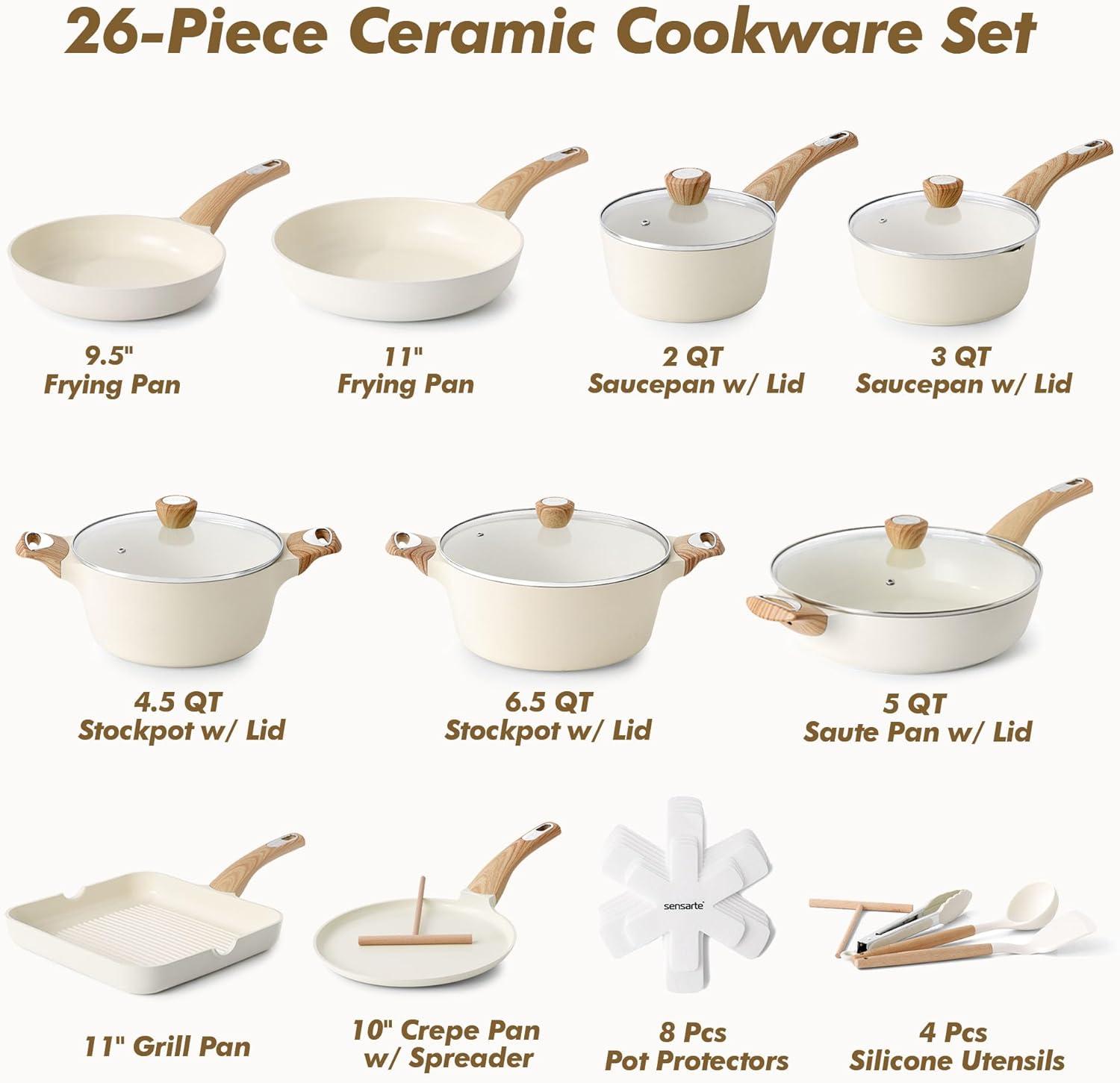SENSARTE Ceramic Cookware Sets, Pots and Pans Set Non stick, Non toxic Healthy Induction Cookware, 26 Pcs Nonstick Kitchen Cooking Set, w/Frying Pans Set, Saucepans Set(Ceramic White)