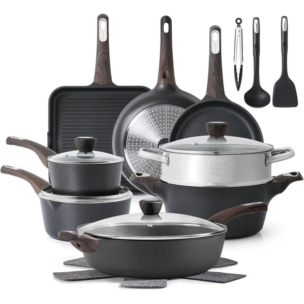20-Piece Pots and Pans Set Includes – 9.5 & 11 inch frying pan set, 5Qt saute pan with lid, 4.5Qt casserole with lid & steamer, 1.5Qt & 2.5Qt saucepan with lid, 11 inch grill pan, Silicone spatula & spoon & tong, 5pcs pot protectors.