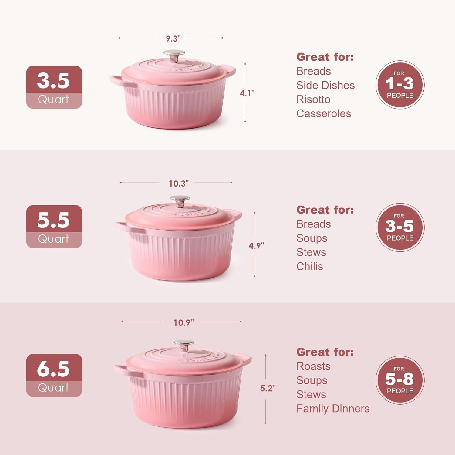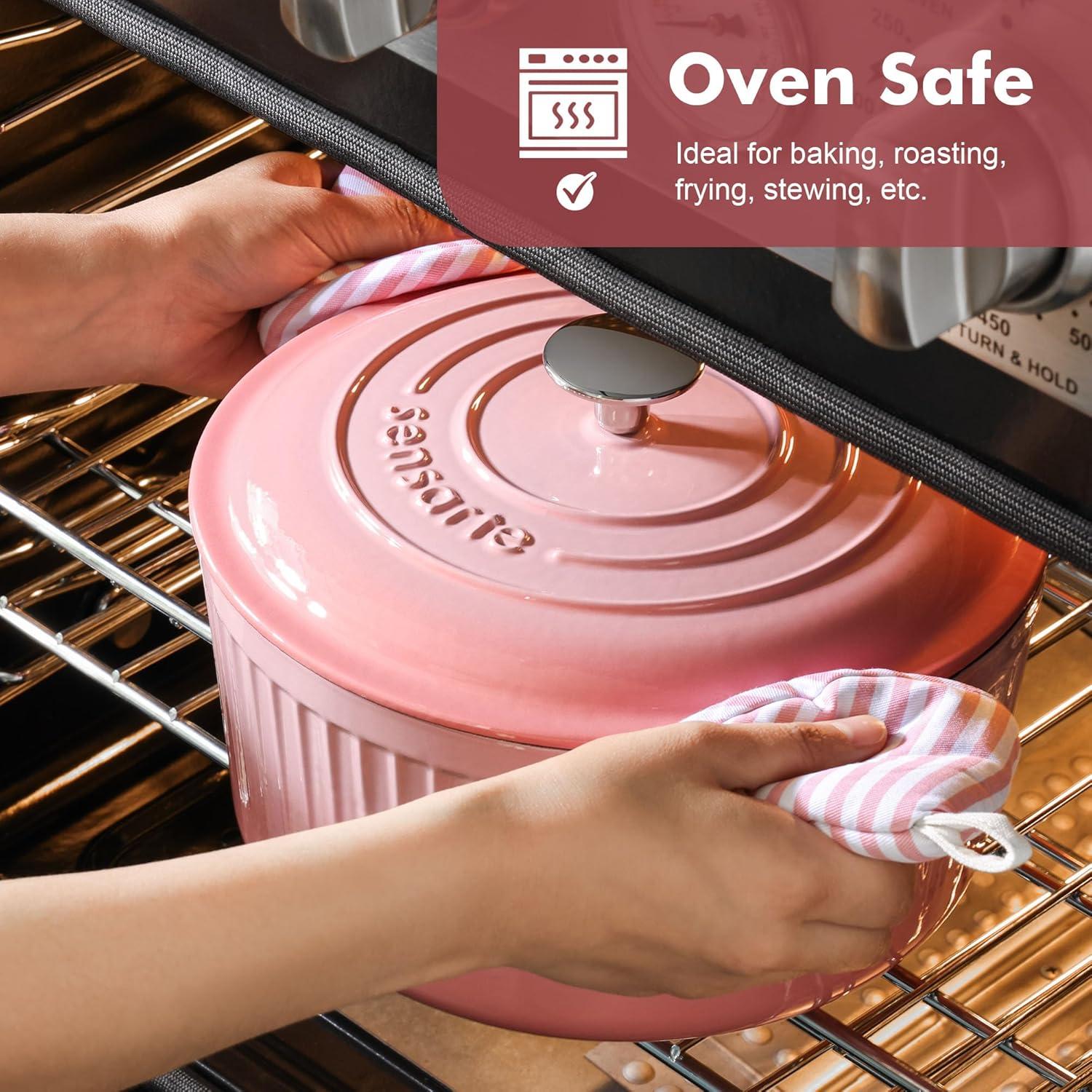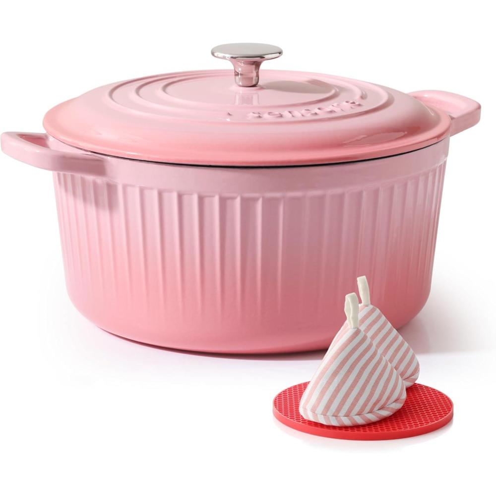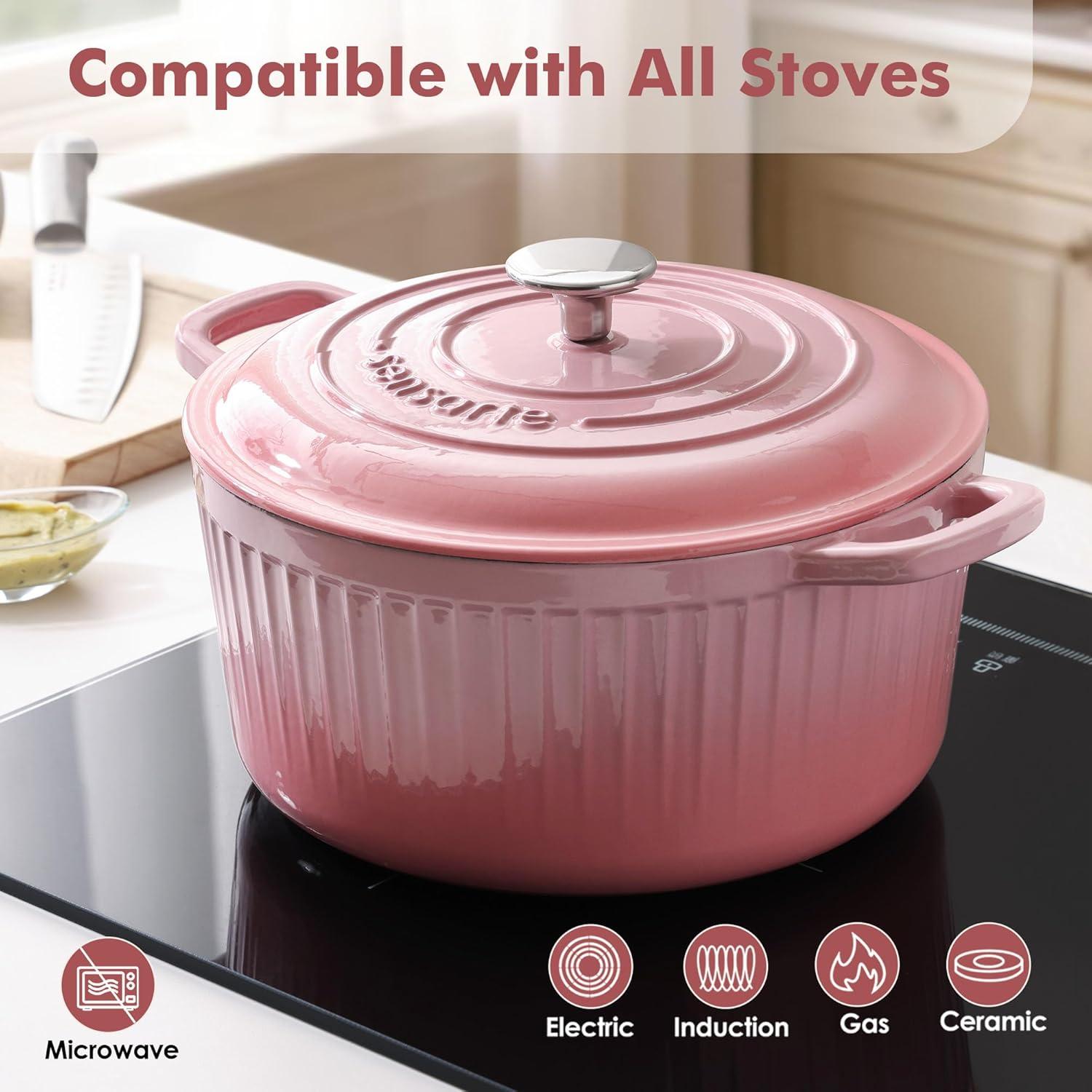 imageSENSARTE Enameled Cast Iron Dutch Oven Pot with Lid 55 Quart HeavyDuty Round Dual Handles Kitchen Pot with Cotton Potholders amp Silicone Trivet Pot for Bread Baking Stews Braising Roasting Oven Safe up to 500F RedCoral Pink