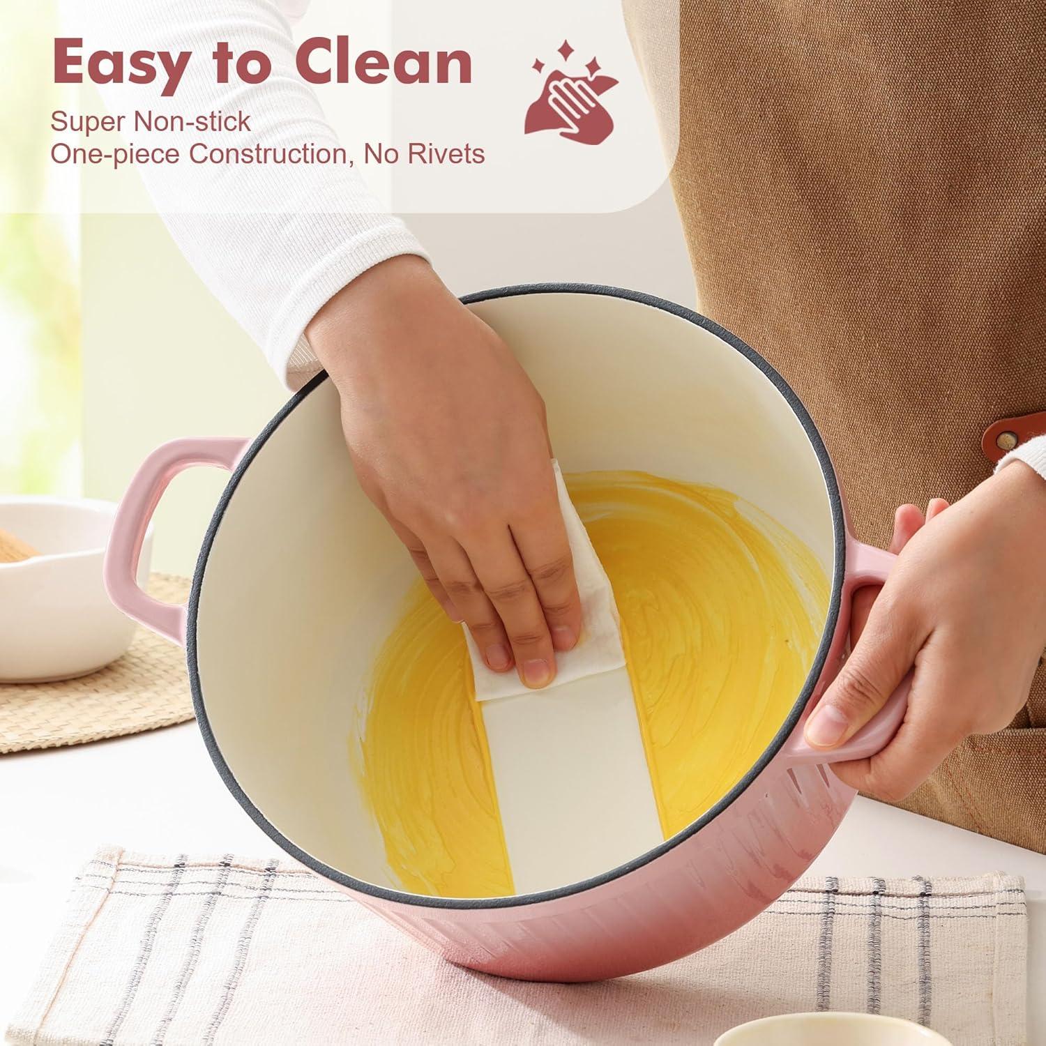 Easy Cleaning: The porcelain enamel interiors promote even cooking and easy release of food. Let it cool down and wash with warm, soapy water is recommended. A cotton heat-resistant cap is included to ensure a comfortable grip and safe guard you from burns.