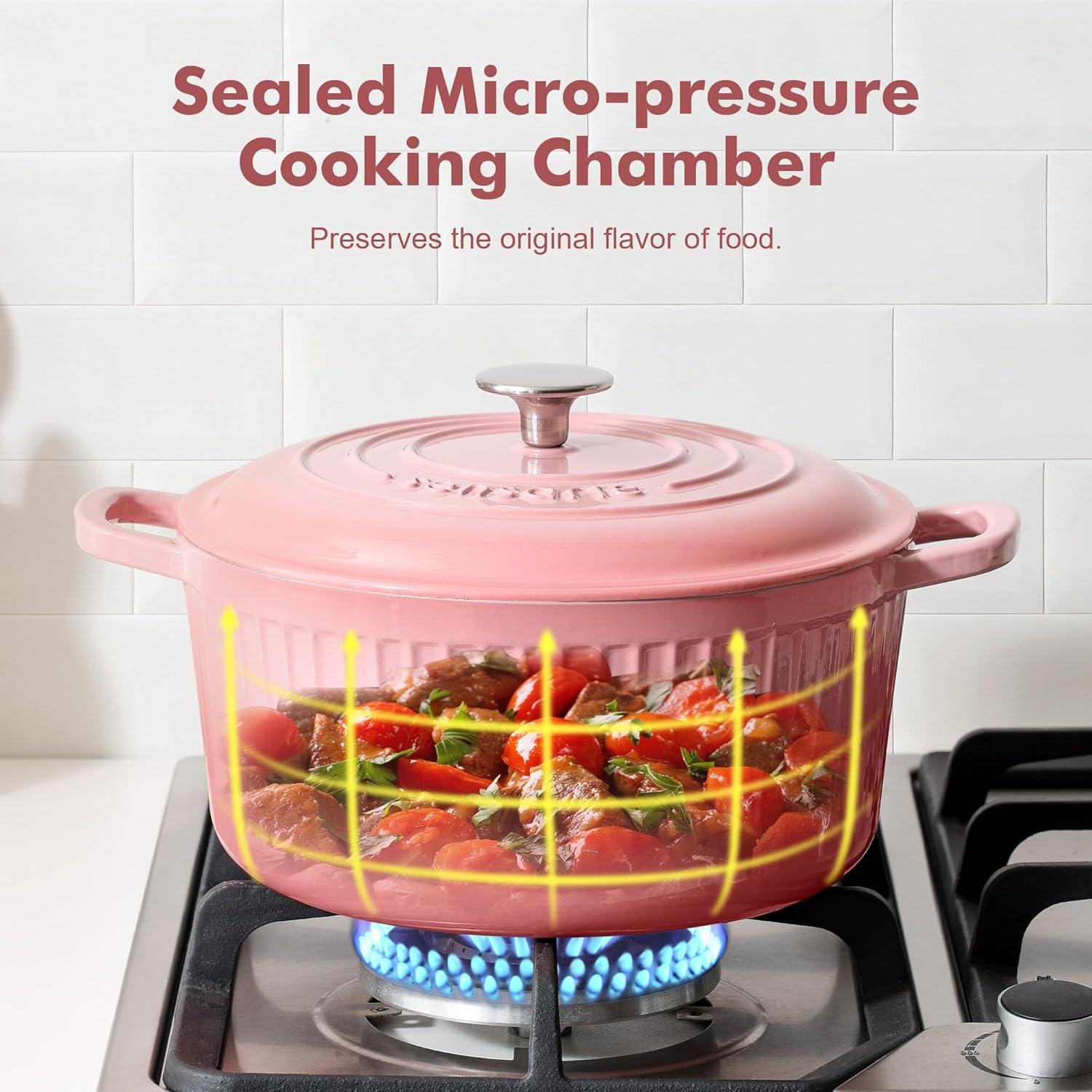 Heat Distribution Retention: This 5.5QT dutch oven made with heavy-duty enameled cast iron ensures even heat distribution for ideal roasting, sautéing, baking, searing, frying and slow cooking, locking in flavors. Keep food warm or cold for serving.