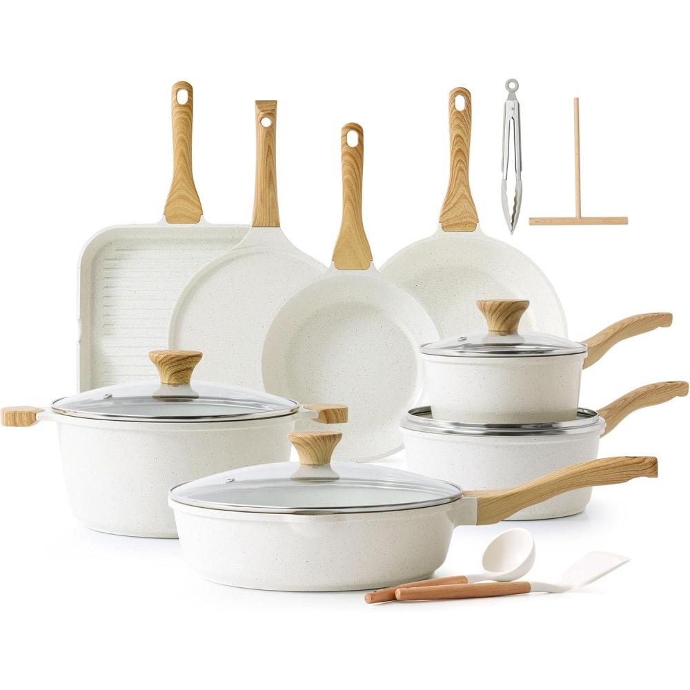 Versatile 23-piece Cookware Set For Large Family – Includes 9.5 & 11-inch fry pan set, 4.5QT/11-inch sauté pan with lid, 1.5 & 2.5-quart saucepan set, and a 4.5-quart casserole pan with lid, and 3 pieces of practical silicone utensils. Meets all your daily cooking need and give you the interest back to cook.