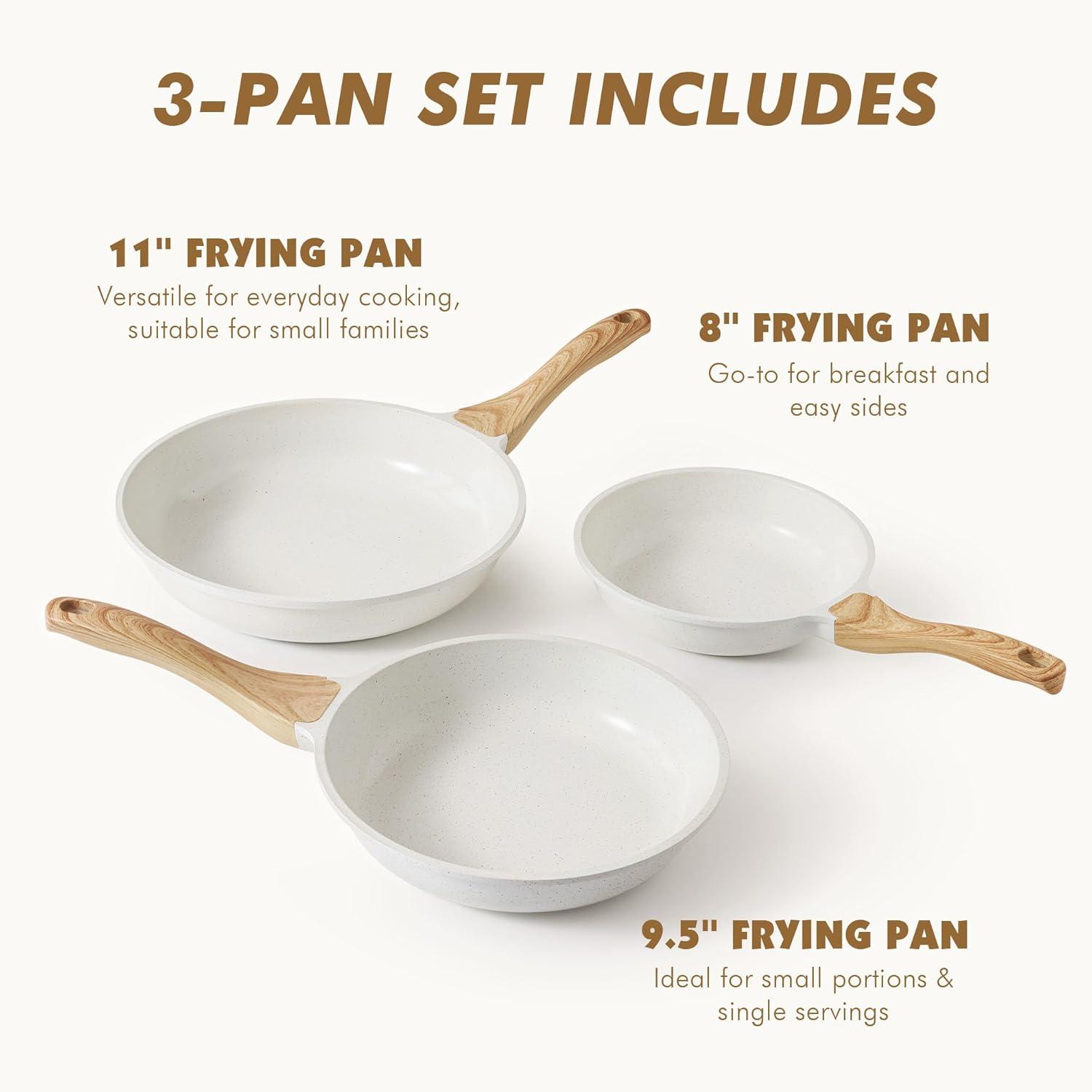 Package Contains – A 8-inch, a 9.5-inch and a 11-inch nonstick frying pan. Perfect for slide-off-the-pan eggs, sauteing veggies, flipping pancakes and more.