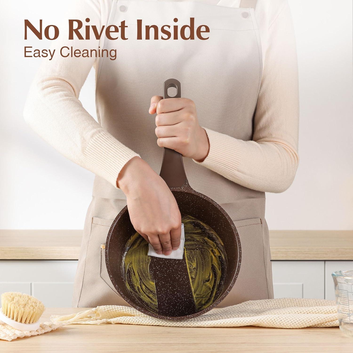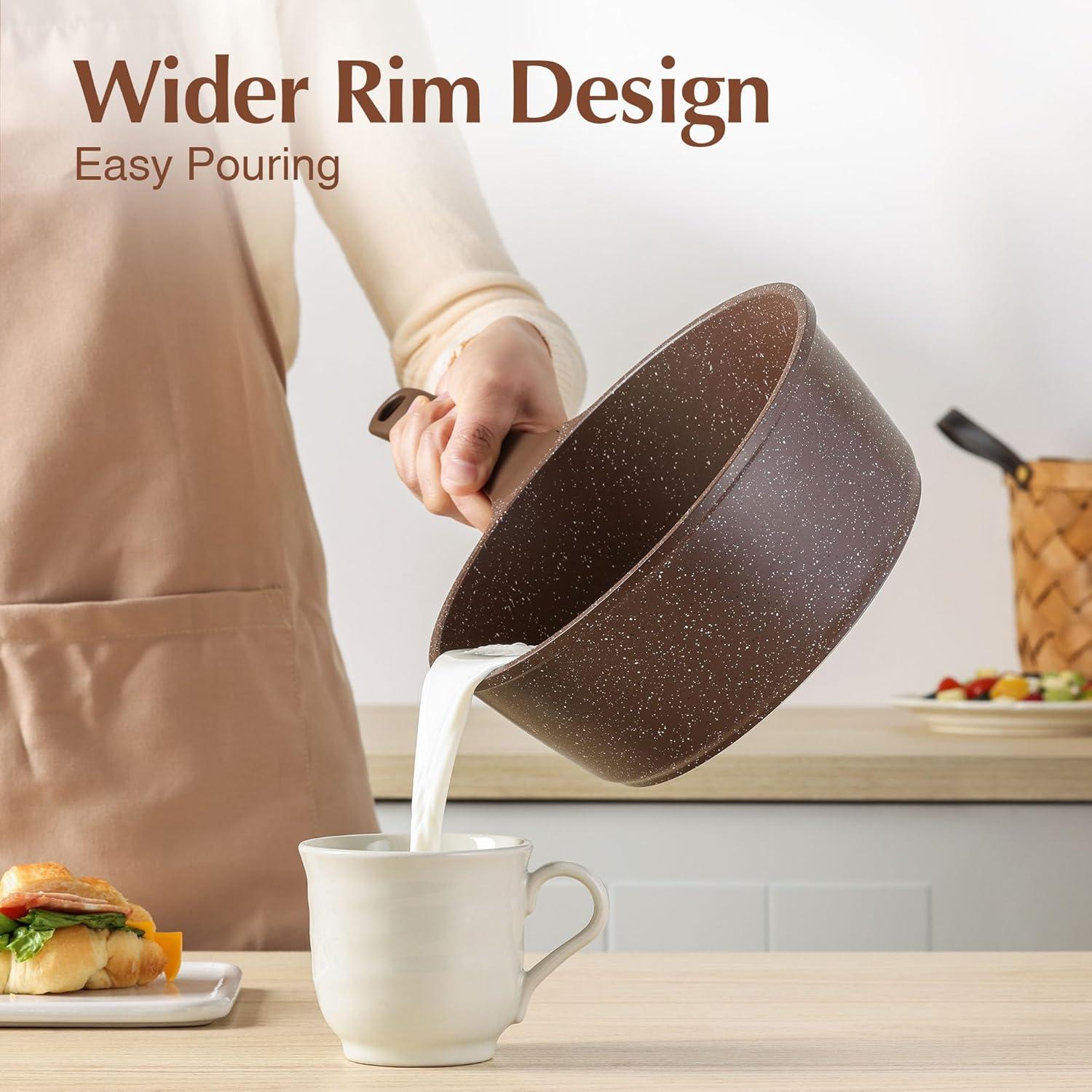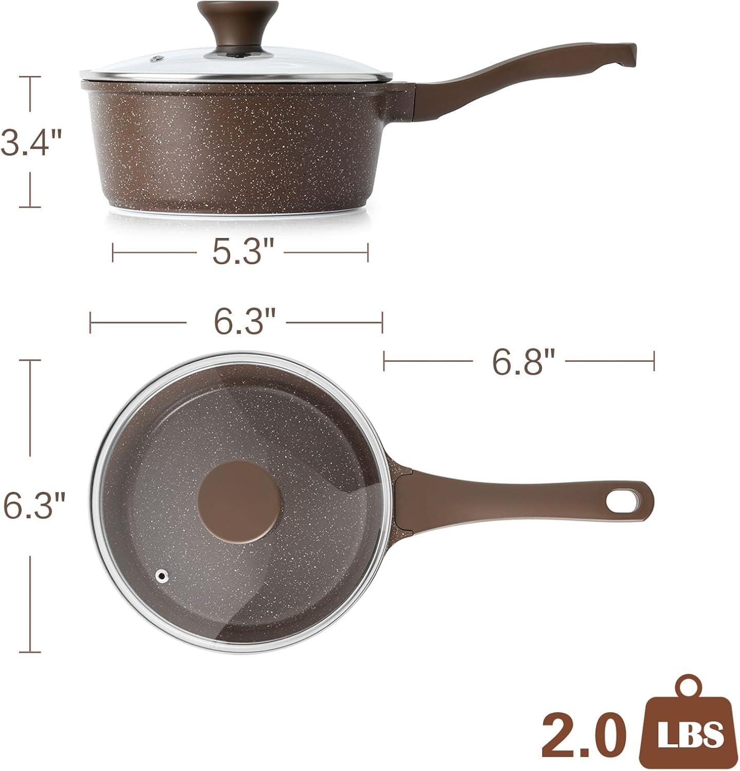 Glass Lid & Stay-cool Handle – Long-lasting tempered glass lid makes this small induction saucepan with lid convenient to see the cooking status and limits splashes on your stove. Woodgrain bakelite handle is comfortable to grip and stays cool while cooking. Oven safe to 302°F.