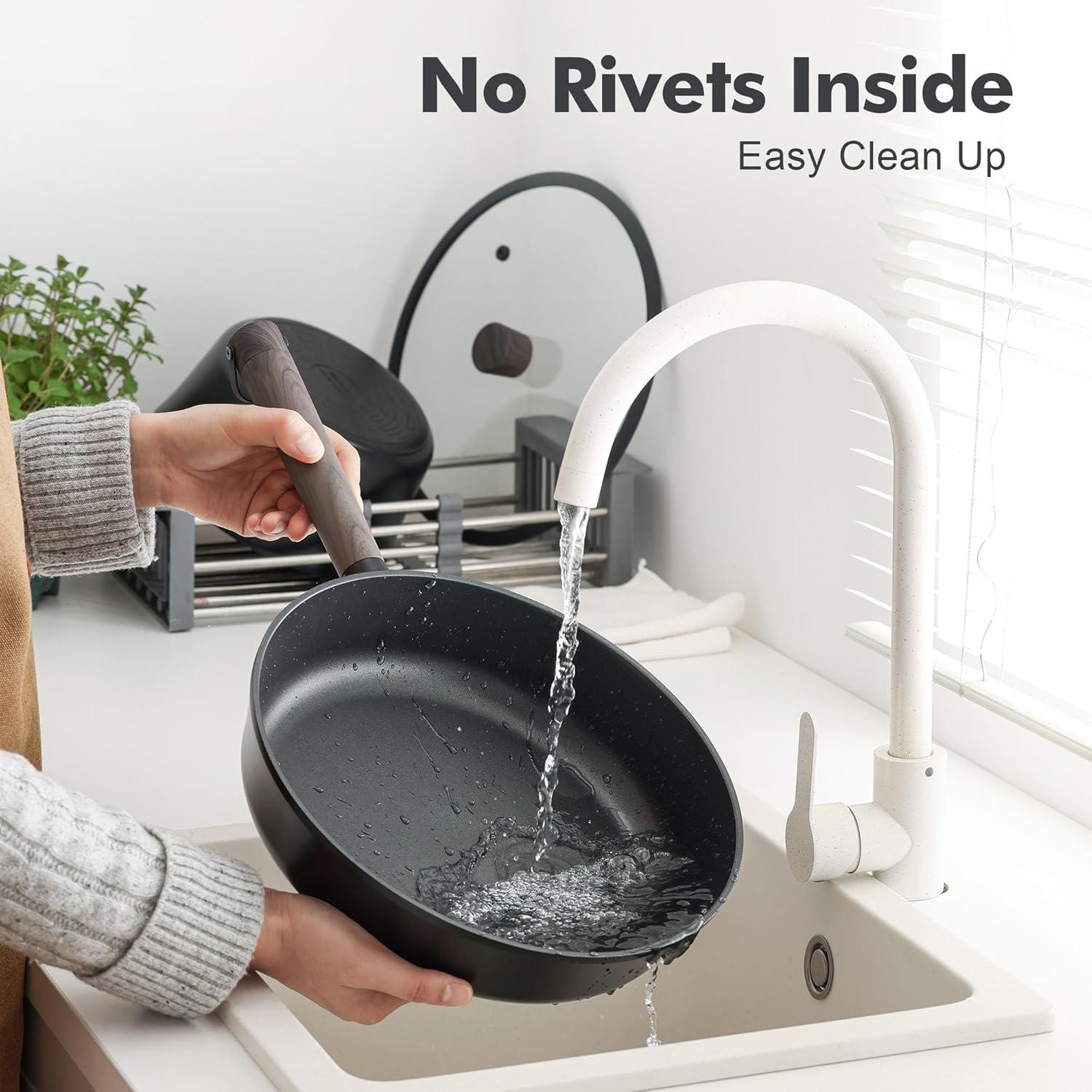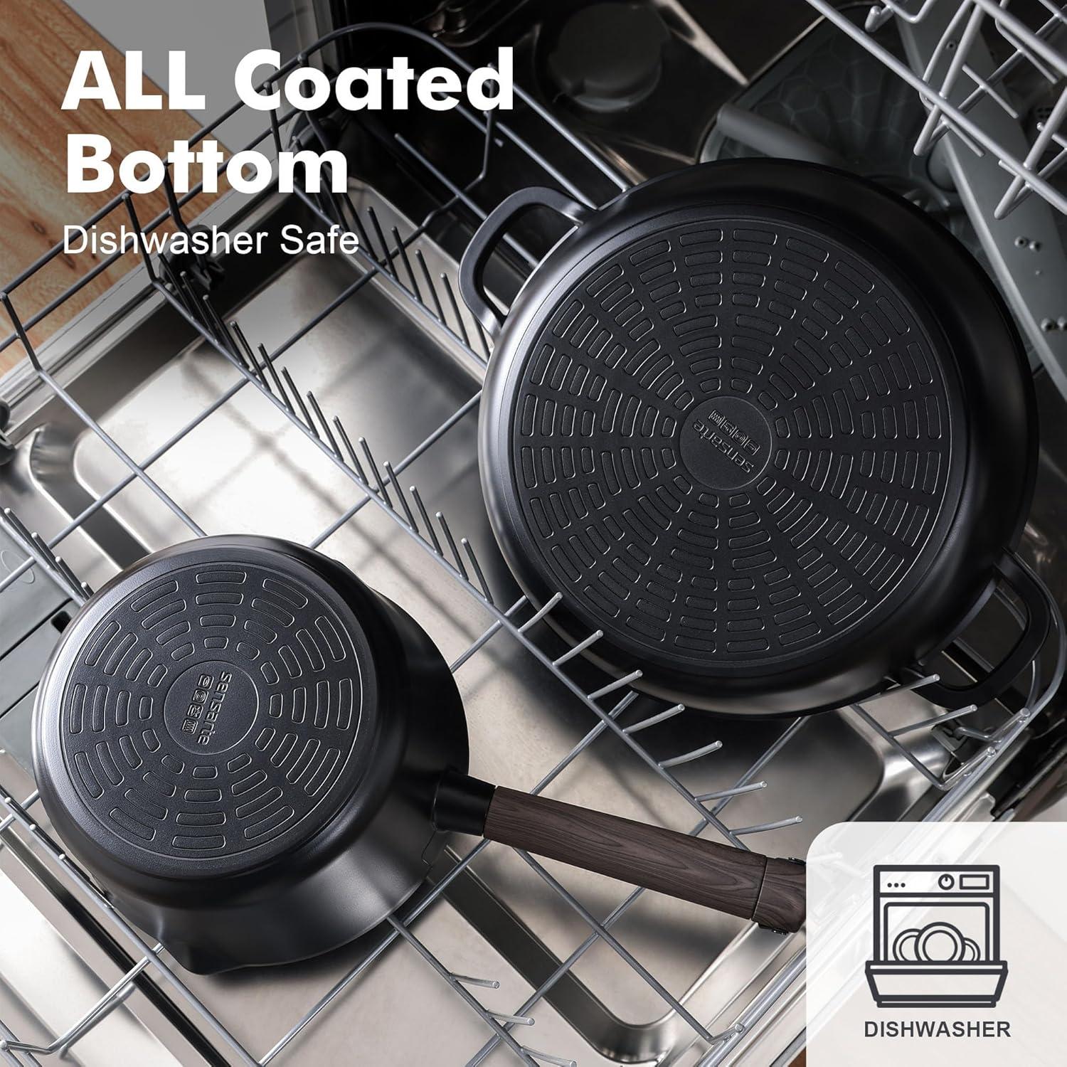 Dishwasher Safe: This black non stick cookware set is dishwasher safe with coated bottom, prevents black residue after washing. Hand wash recommended, simply wipe the pots and pans over with a sponge and warm soapy water.