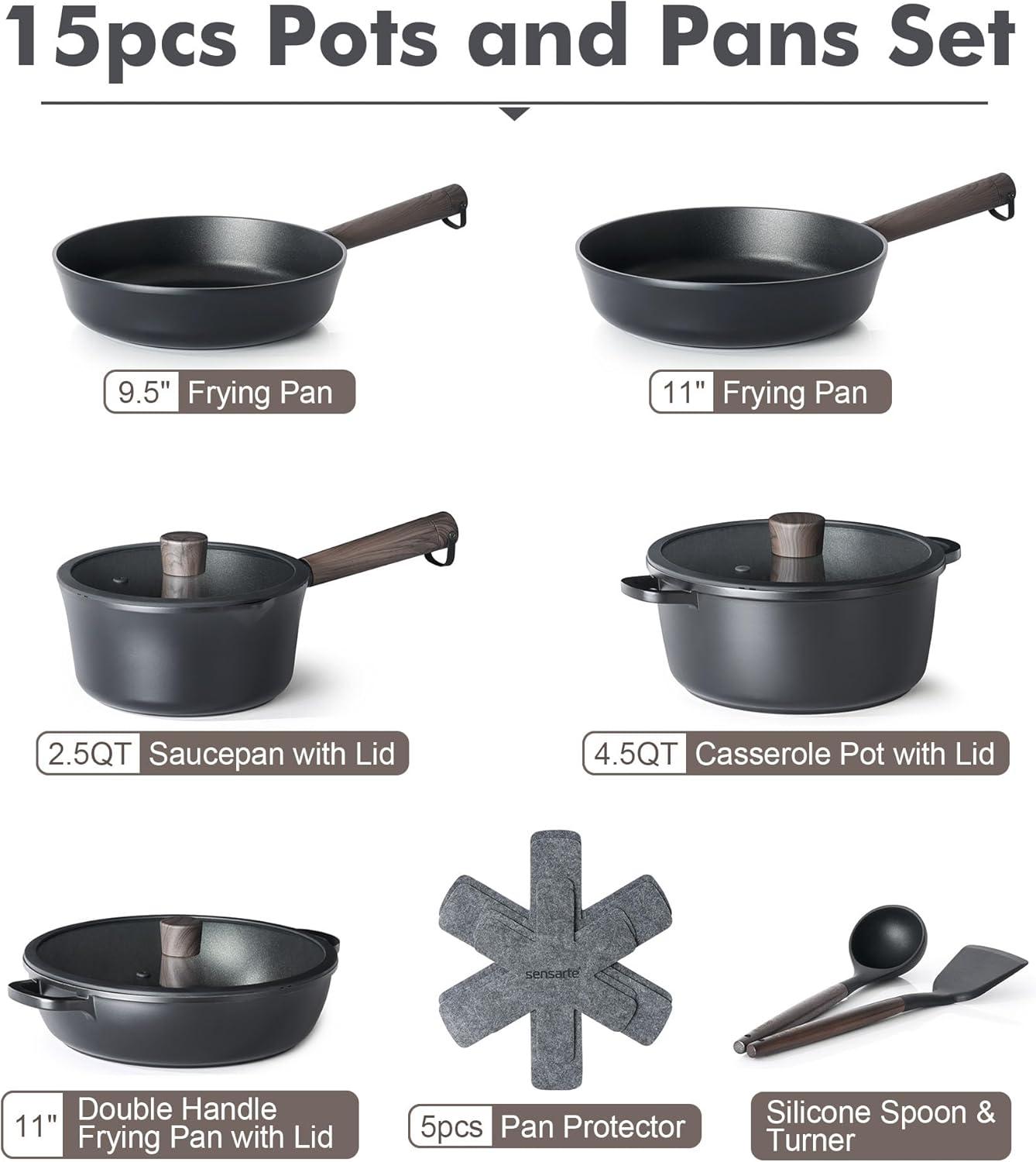 Swivel Stay-cool Handle: The swivel handle, rotatable metal hook and flat lid make the nonstick black cookware set convenient for hanging or stacking, up to 70% space-saving storage. The woodgrain bakelite handle is comfortable to grip and stays cool while cooking.